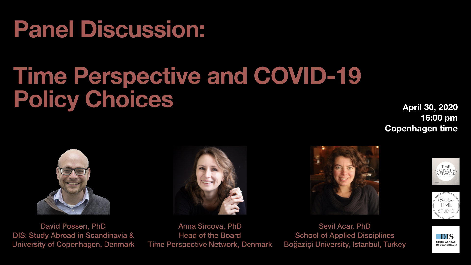 The rapid worldwide spread of the COVID-19 pandemic has forced governments around the world to choose from a difficult menu of policy options, running the gamut from sustained containment efforts (as in South Korea) to forceful suppression of transmission (as in Italy) to mitigation of disease harms with an eye toward attaining herd immunity even in the absence of a vaccine (Sweden). These difficult policy choices are inevitably shaped by attitudes toward the future – and, more generally, by variations in time perspective – among the policymakers and broader populations involved. In this panel discussion, we investigate the relationship between time perspective and COVID-19 policy choices, harnessing the results of an recent policy simulation experiment conducted in a course on environmental economics and public policy at DIS: Study Abroad in Scandinavia.